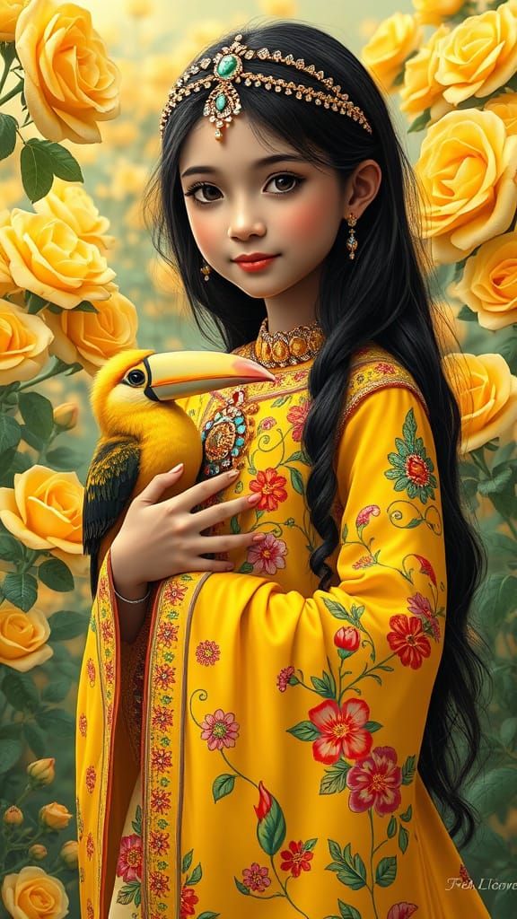 This image shows a young Muslim girl surrounded by beauty, wearing a stunning traditional gown and holding a colorful toucan, amidst a vibrant yellow rose garden, with intricate details and lush textures, in a realistic yet fantastical style