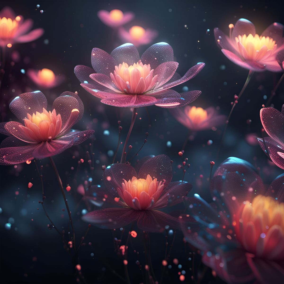 This image shows ethereal flowers illuminated against a dark background. The image is a high-resolution render with vibrant colors and striking contrast between the flowers and the void.