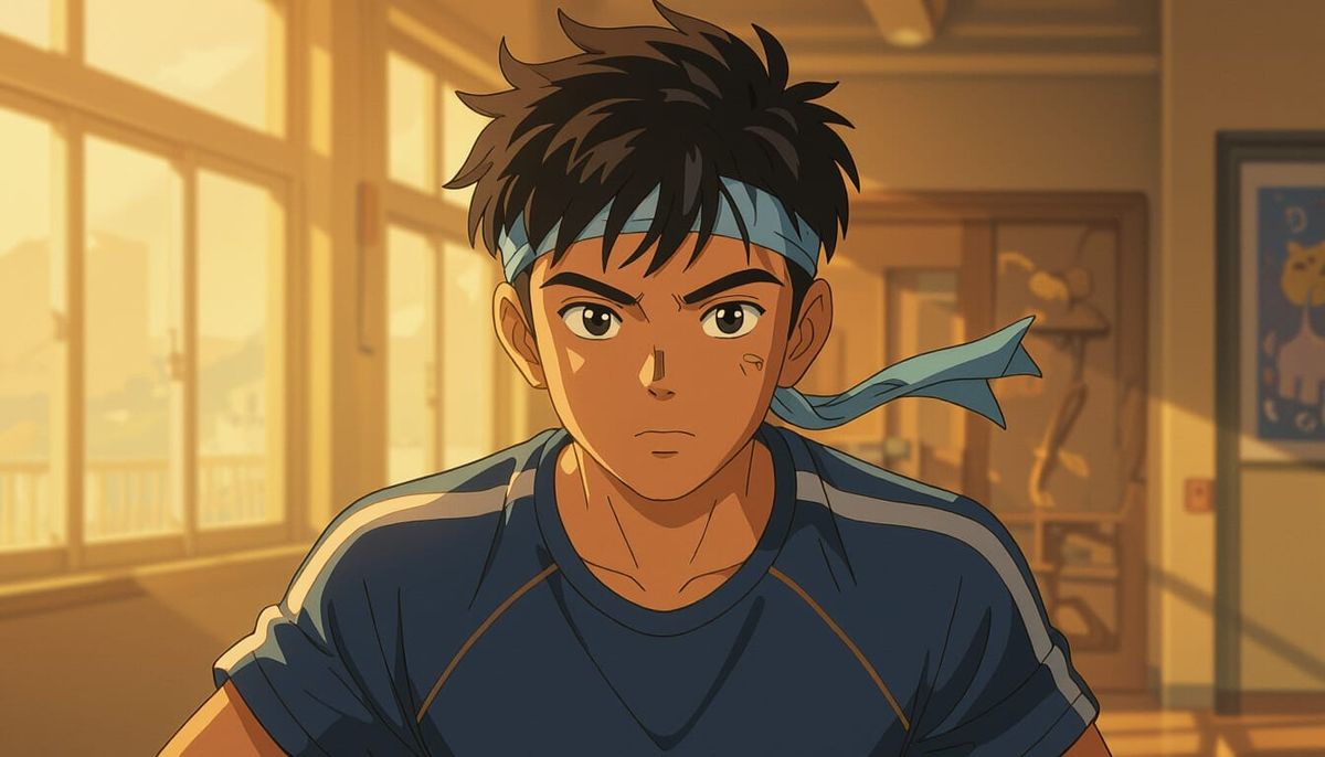 This image depicts a determined young Indian boy in athletic wear, captured in a motivational pose. Features warm cinematic lighting and a soft glow, rendered in a detailed cartoon style with vibrant colors.