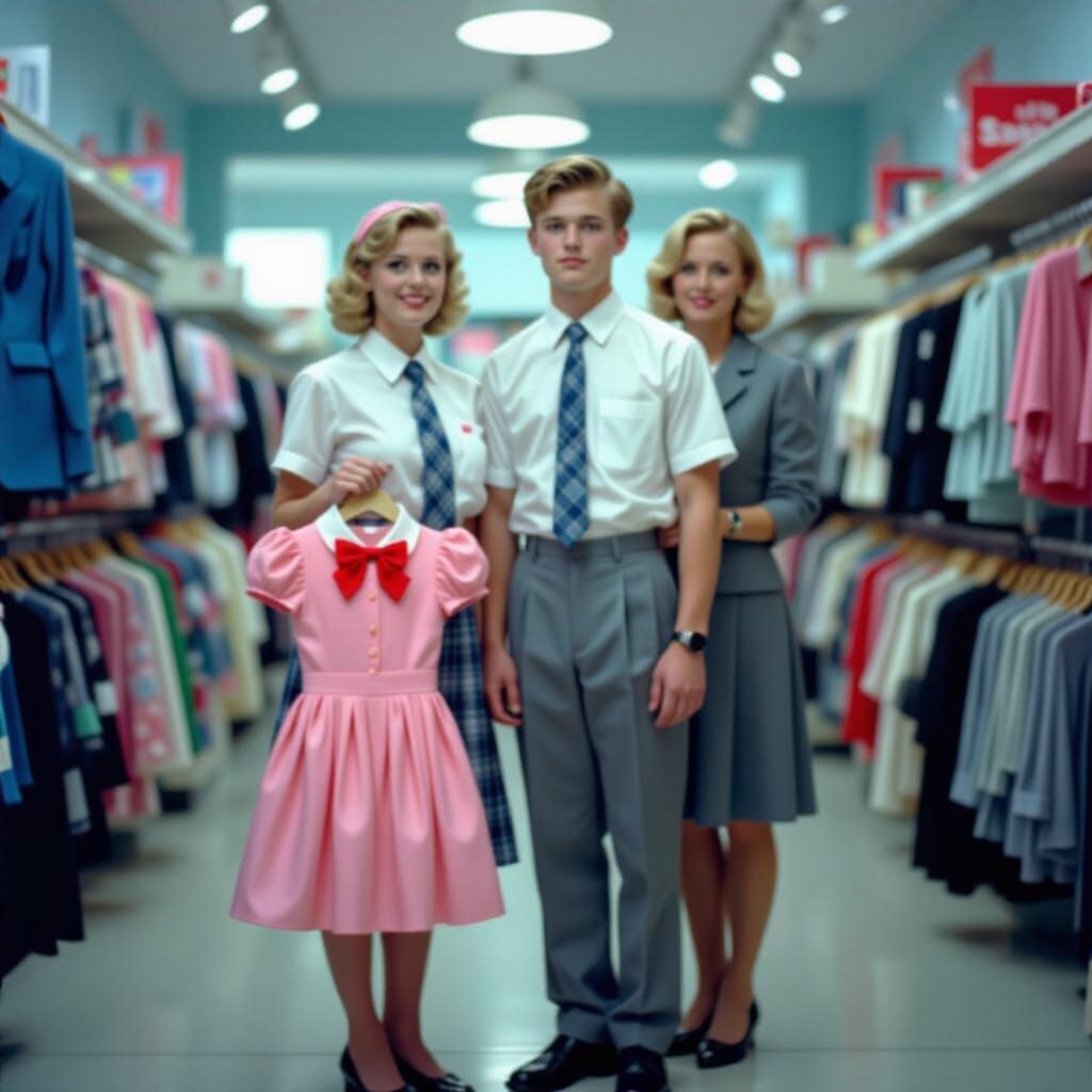 A cinematic image of a young blond man in school uniform in a clothing store. He holds a pink dress and wears a red bow, captured with film grain and color grading.