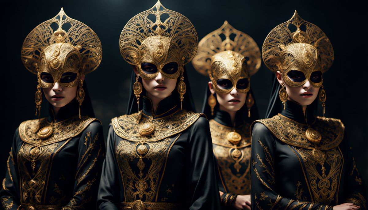 This image shows three masked women adorned with golden headpieces and beaded veils. Set against a dark backdrop with subtle Egyptian hieroglyphs, the scene evokes a surreal and opulent high-fashion aesthetic.