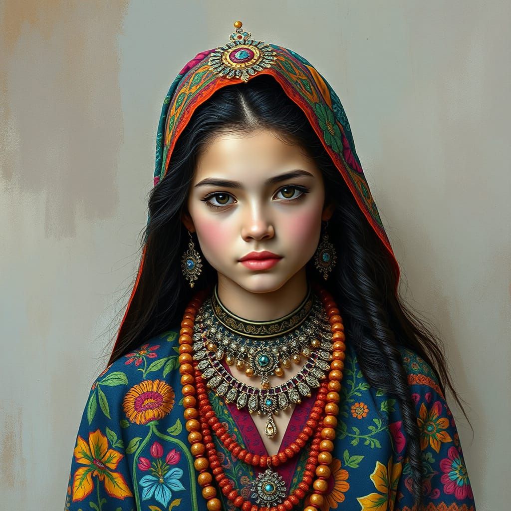 This hyperrealistic image features a teenager adorned in vibrant, patterned clothing and detailed ancient jewelry. Rendered with thick, textured brush strokes in a Gouache style, it evokes a maximalist aesthetic.