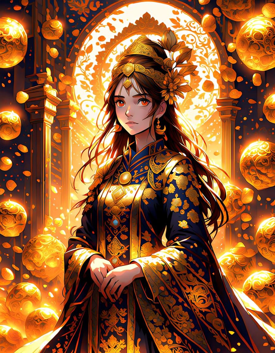 This digital art illustration features a woman in opulent attire, covered in shimmering gold coins and jewels. Volumetric lighting creates a warm, golden glow, highlighting intricate details and rich textures.