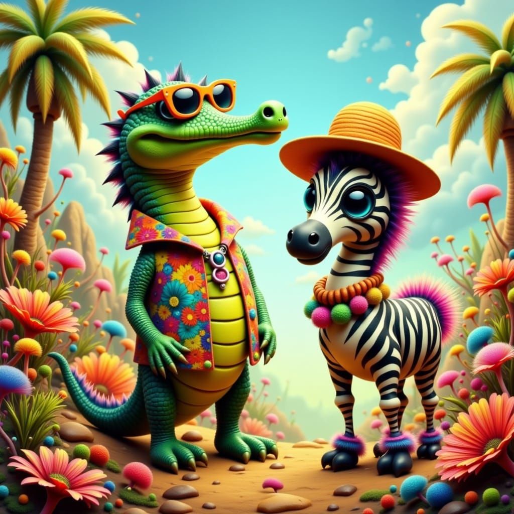 A crocodile in a Hawaiian shirt and sunglasses stands with a zebra wearing a scarf and hat. The scene is a vibrant savannah, capturing a whimsical artistic style.