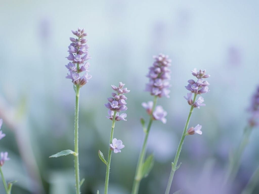 A dreamy image of lavender flowers with purple blooms and green stems. The artwork features a soft, blurred background in soothing shades, rendered in a whimsical pastel art style.
