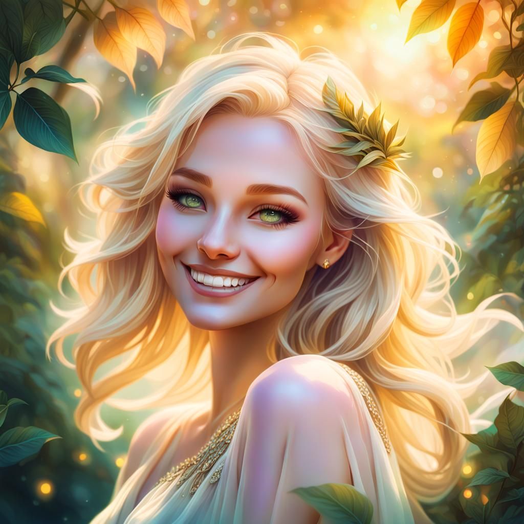 A softly focused portrait of a beautiful blonde girl smiling amid lush green foliage. Dreamy golden light and a warm pastel color scheme create an ethereal fantasy aesthetic.