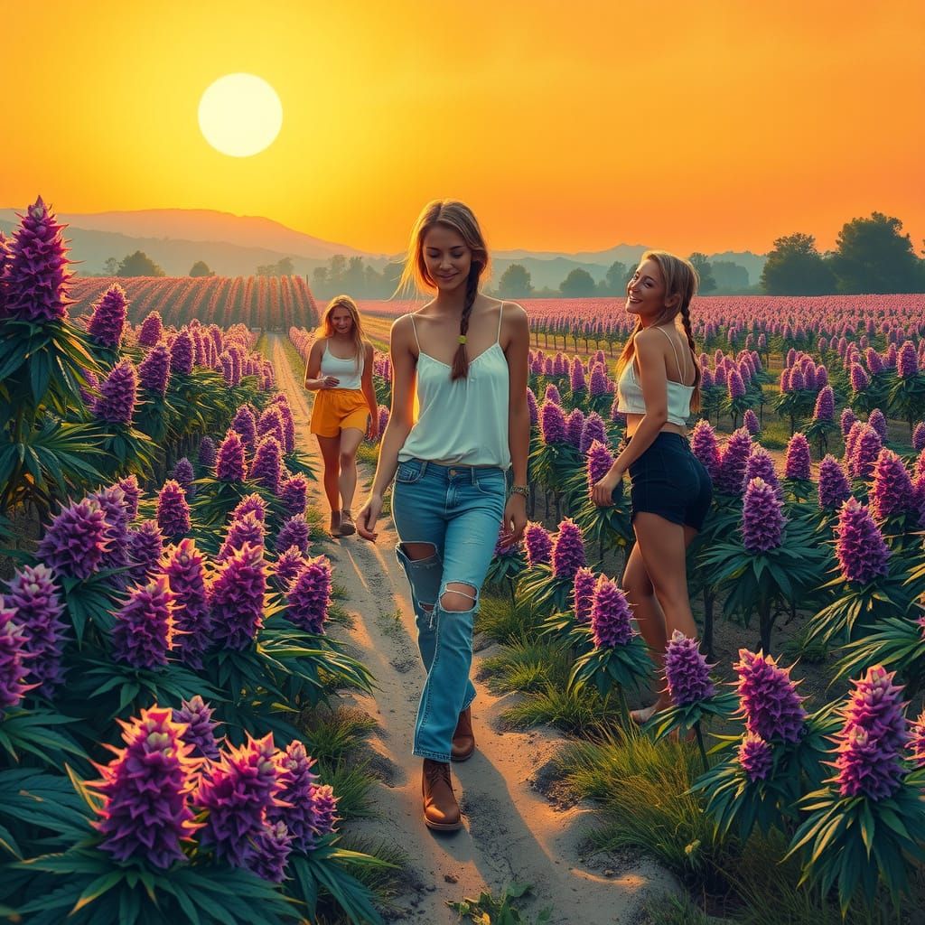 This idyllic cannabis farm scene combines vibrant purple plants with the effortless beauty of farm girls harvesting the crop. Inspired by Marc Chagall's whimsy and Henri Matisse's color palette, the scene is bathed in a warm, ethereal light with a golden sunset glow.
