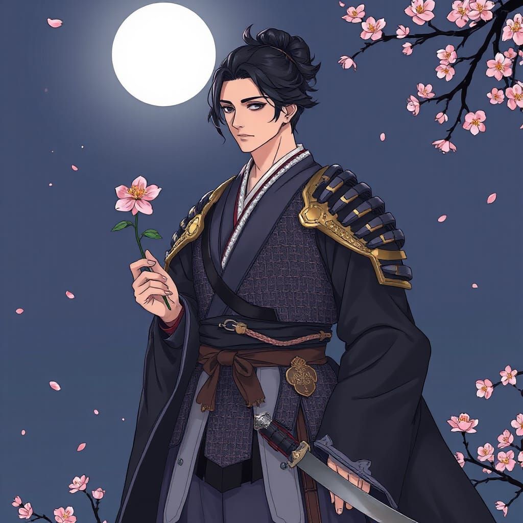 This image shows a beautifully attired samurai in Japanese armor, holding a flower under the moonlight. Cherry blossoms surround him, rendered with intricate linework and elegant character design.