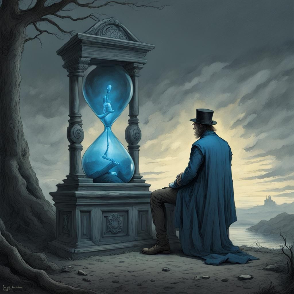 This image shows a man seated on a bench, gazing at a large blue hourglass. The scene evokes a sense of awe, rendered in a dramatic, horror-inspired style.