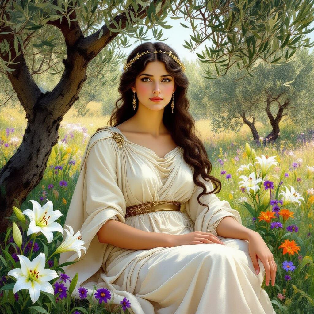 This image shows a marble statue of a Roman goddess in a garden. The statue is surrounded by olive trees, lilies, and wildflowers, creating a photorealistic digital artwork.