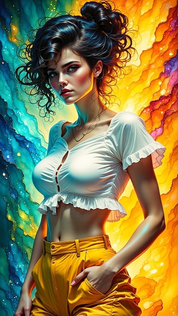This striking image depicts a stylized fashion illustration of a woman in a black and white drawing with vibrant color accents. Dynamic lighting and energy flows enhance the portrait.