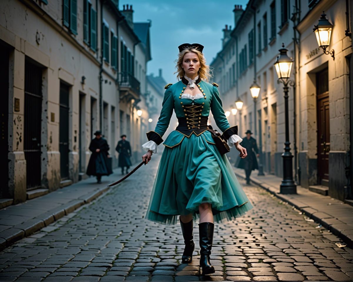 This image shows a blonde woman in a turquoise military-style outfit and tulle skirt walking down a street at night. The photograph features a foggy, mysterious atmosphere.