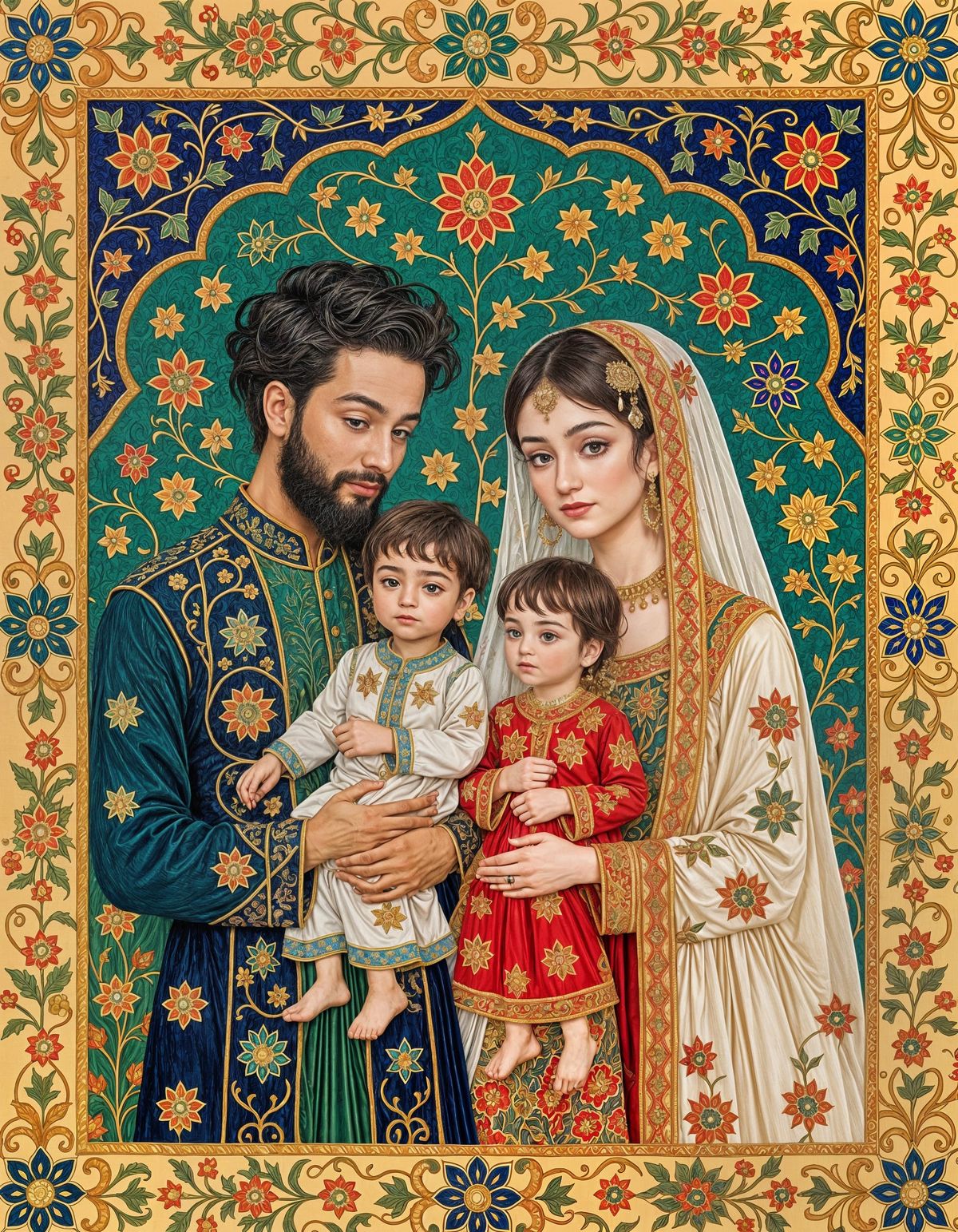 Easily create stunning images of Iranian couples and families with intricate oriental patterns. Start generating for free!