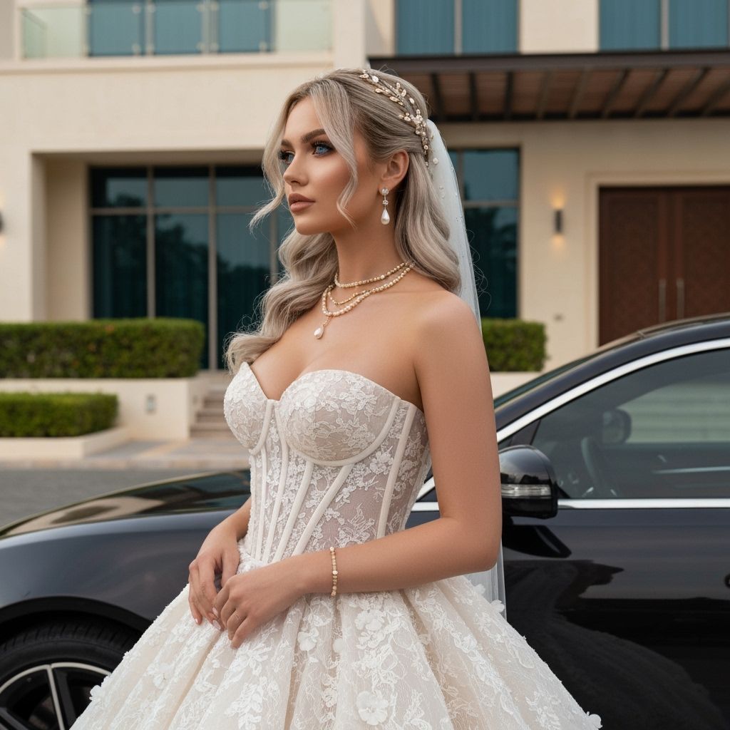 This image shows a beautiful young woman in a wedding gown posing next to a luxury car in Dubai. The gown features a sweetheart neckline, structured bodice, and sweeping skirt, highlighting her figure.