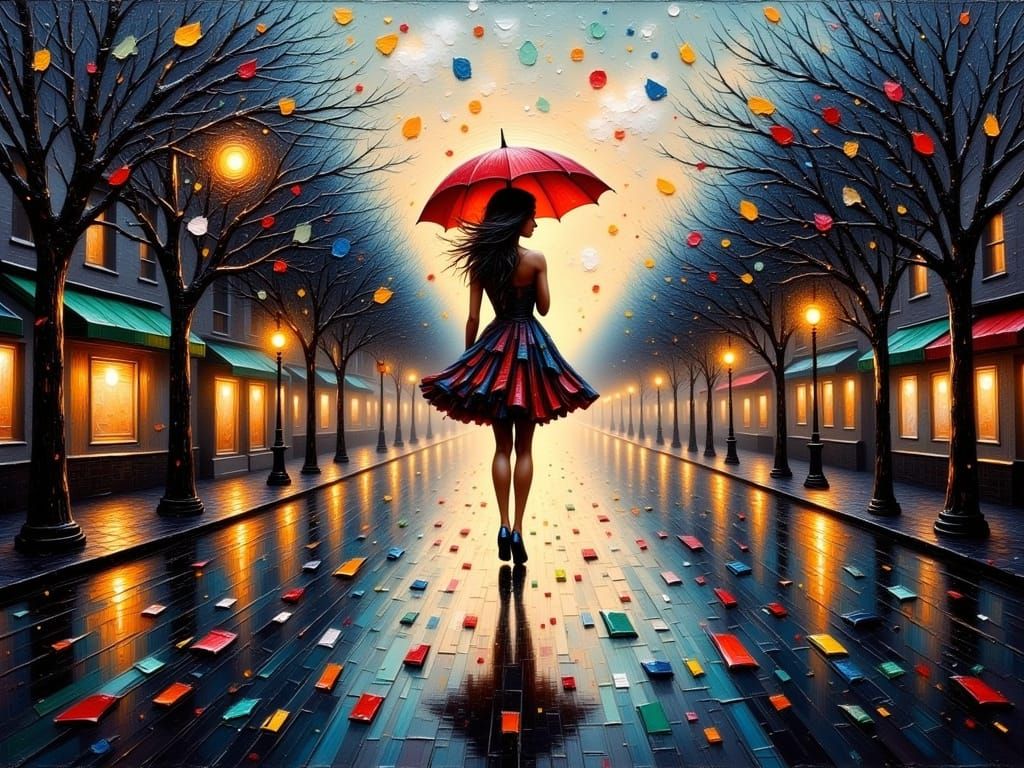 This image is a dramatic depiction of a woman walking alone on a rainy city street at night, with vibrant colors contrasting against a black and white backdrop, featuring textured, impasto brushstrokes and a moody atmosphere.