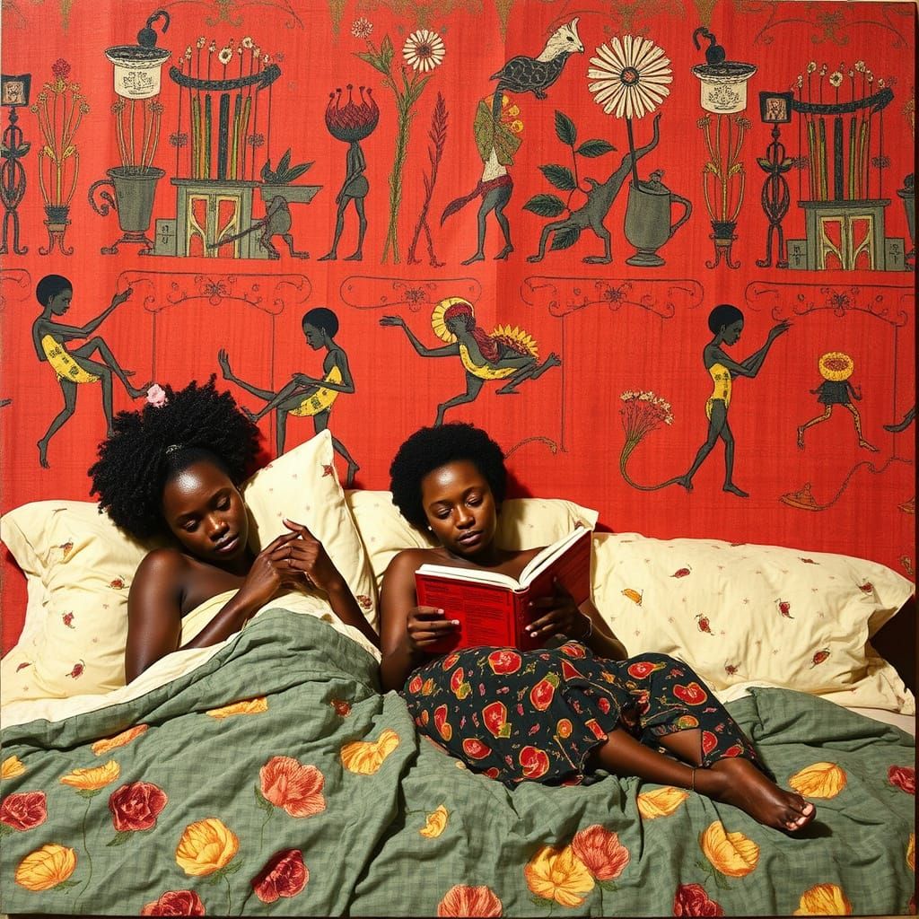 A serene image depicting someone reading comfortably in bed, rendered with bold, layered textures and vibrant abstract elements inspired by modern art.