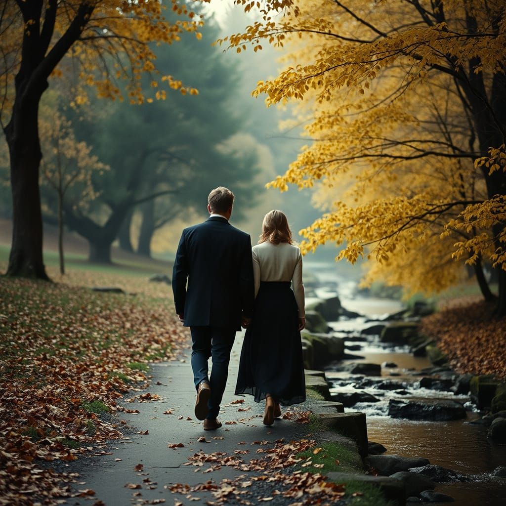 This image captures a couple walking by a stream in an autumn park, with golden leaves falling. Presented as a cinematic film still with soft lighting and atmospheric mist.