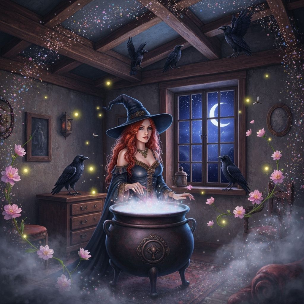 This oil painting captures a witch with red hair beside a bubbling cauldron in a cozy cottage. Steampunk elements and Impressionist techniques create a magical, starry night scene with fireflies and floating flowers.
