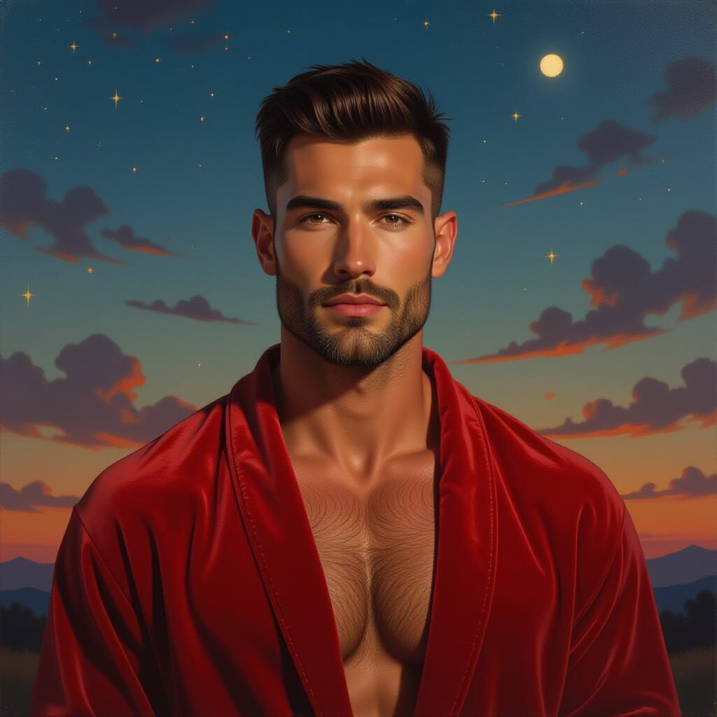 A striking picture of a handsome man in a red velvet robe against a night sky. This digital painting is rendered in an impasto style with textured brushstrokes, warm lighting, and deep shadows.