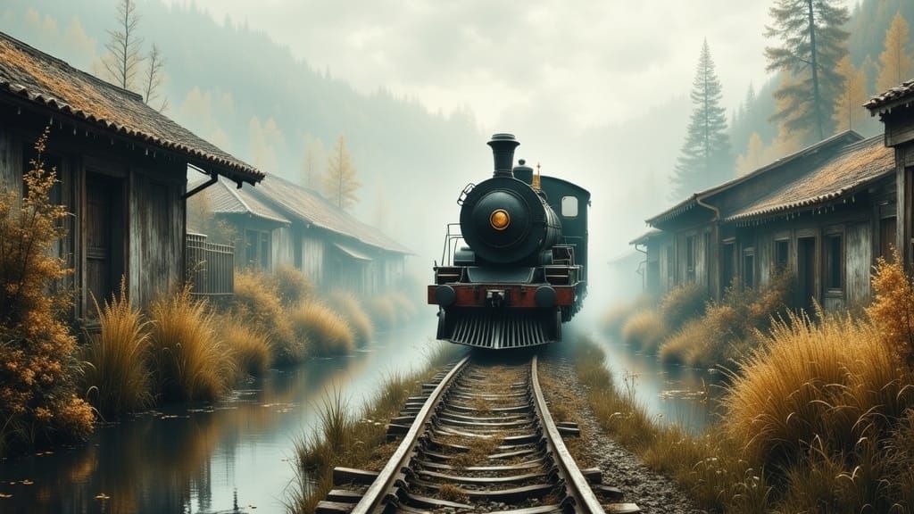 This image depicts a solitary, weathered locomotive on a forgotten track, surrounded by mist and overgrown cabins with Chinese architectural elements. Rendered in a painterly concept art style, it evokes quiet isolation and nostalgic decay.