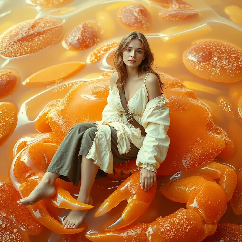 A serene woman with golden hair rests on a giant gummy crab amidst a fizzy soda ocean. Features a misty atmosphere and delicate lines with neon glow.