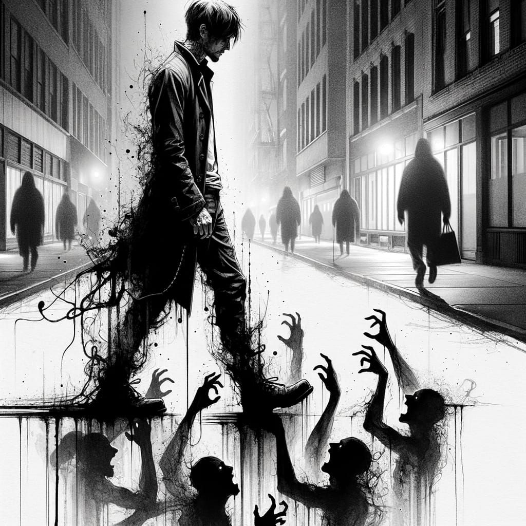 A haunting, monochromatic image of a Hispanic man in gothic attire walking down a deserted city street at night, unaware of demonic entities grasping his feet from beneath the ground, evoking a sense of unknown fear and insecurity.