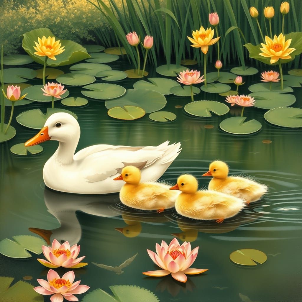 A charming image of a duck family in a peaceful pond setting. The scene evokes a whimsical, painterly style, reminiscent of classic children's book illustrations with warm lighting.