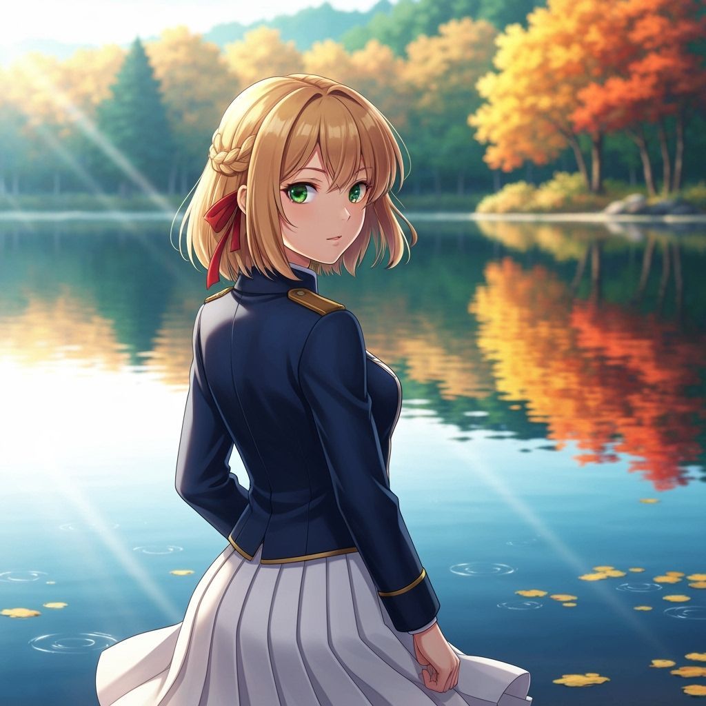 A striking picture of a young woman with braided blonde hair standing by a lake in autumn. She is wearing a Victorian-style jacket and skirt, rendered as detailed anime art.