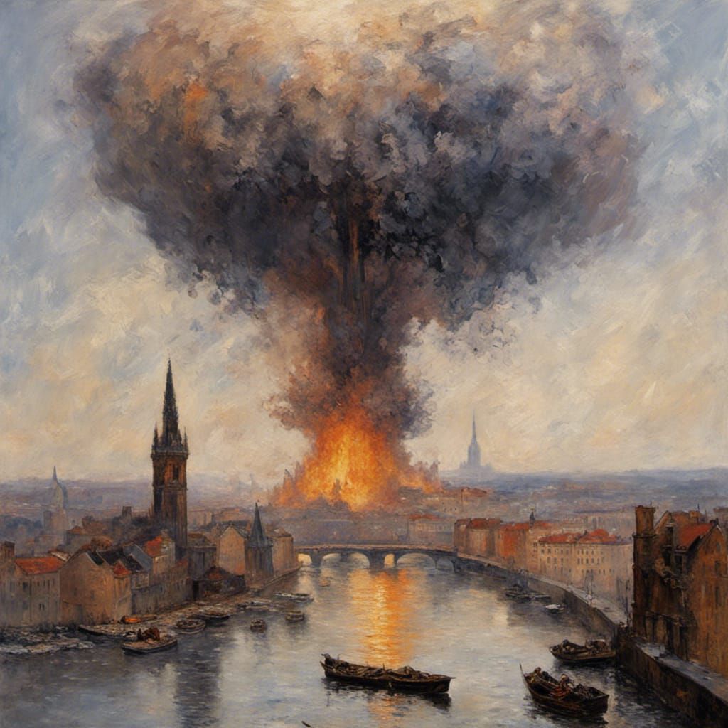 A dramatic image of an atomic bomb exploding over a ruined Prague, during a fictional World War 3 scenario. Rendered as an impressionist oil painting.