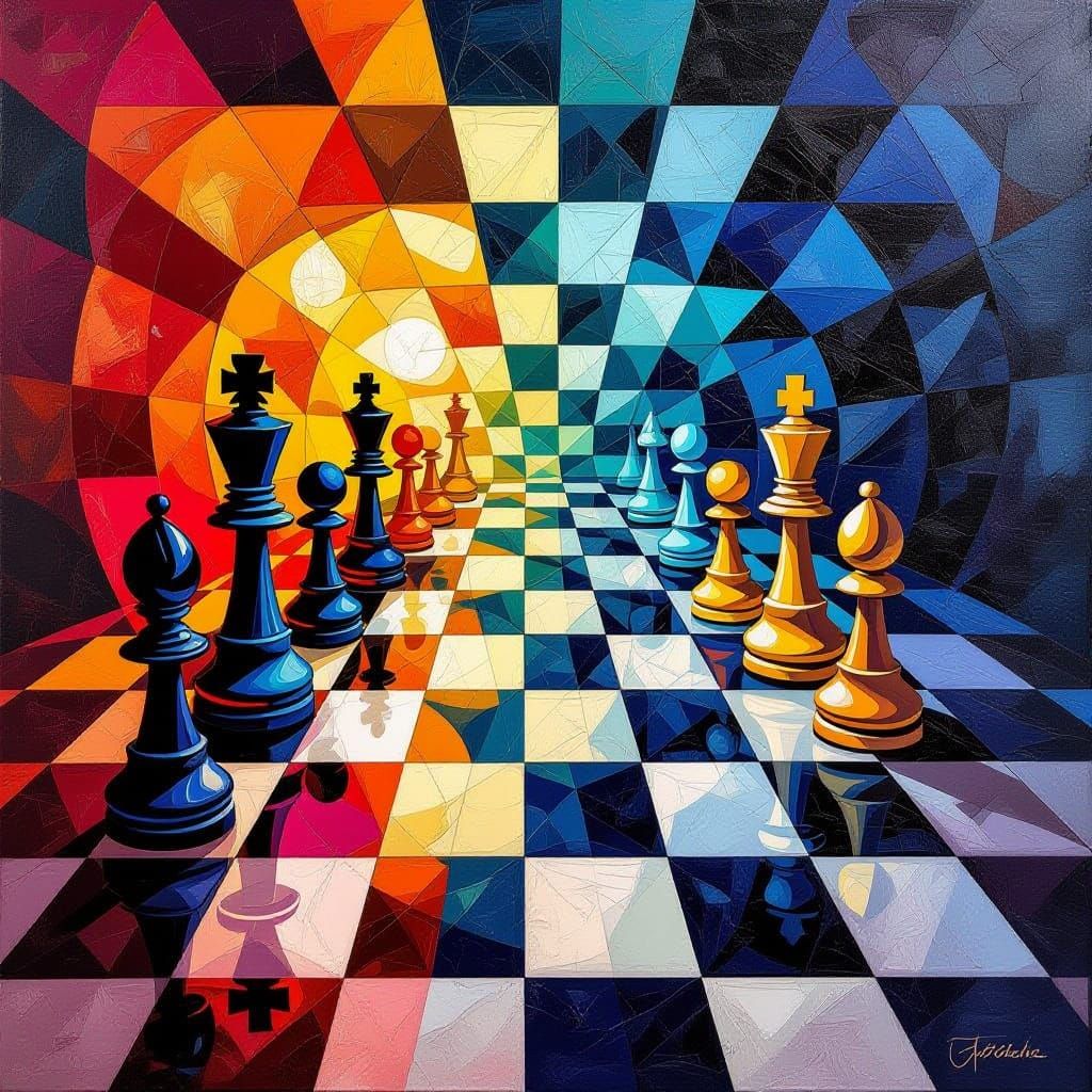 This abstract artwork features a dynamic and hypnotic composition inspired by a chessboard, rendered with intricate details and a striking complementary color palette.