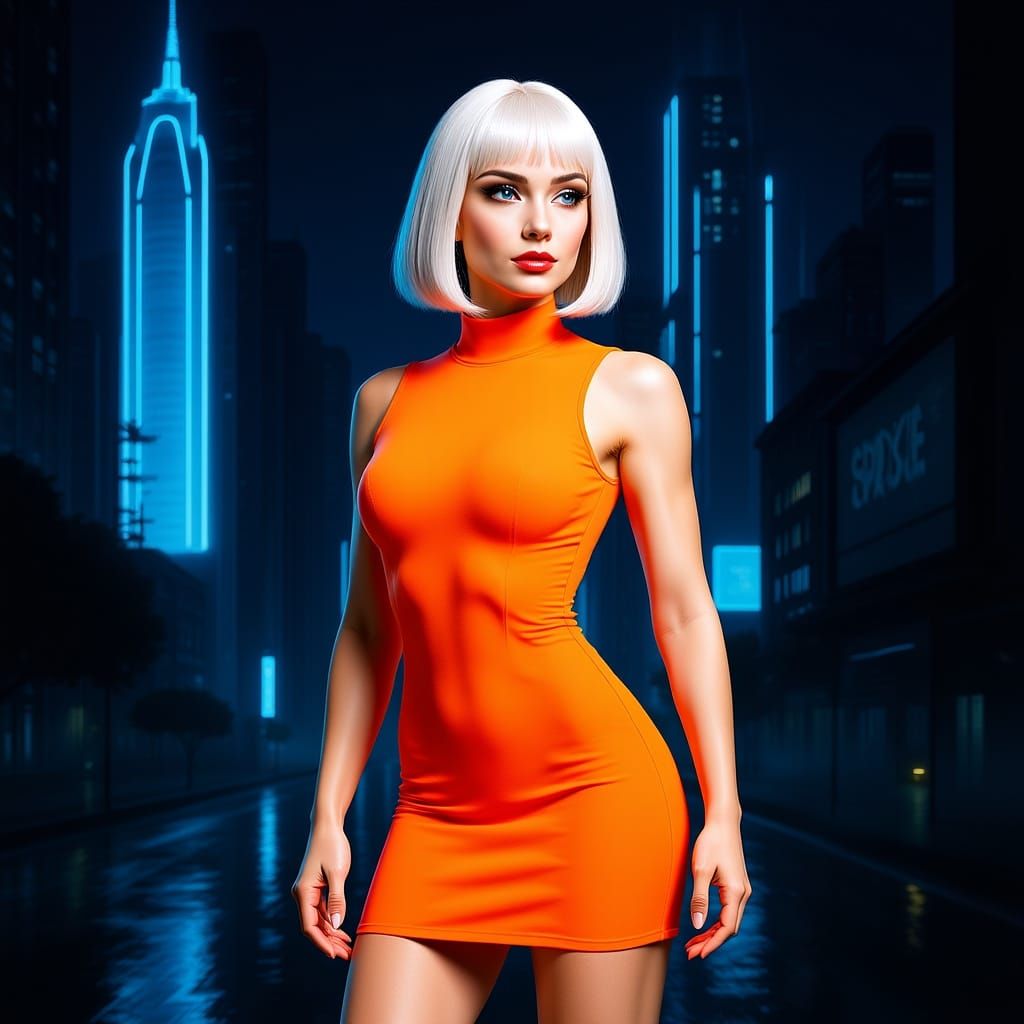 This image shows a striking woman with platinum hair in a futuristic city. She wears a neon dress that glows in the dark, rain-slicked streets, in a cinematic, ultra-modern style.