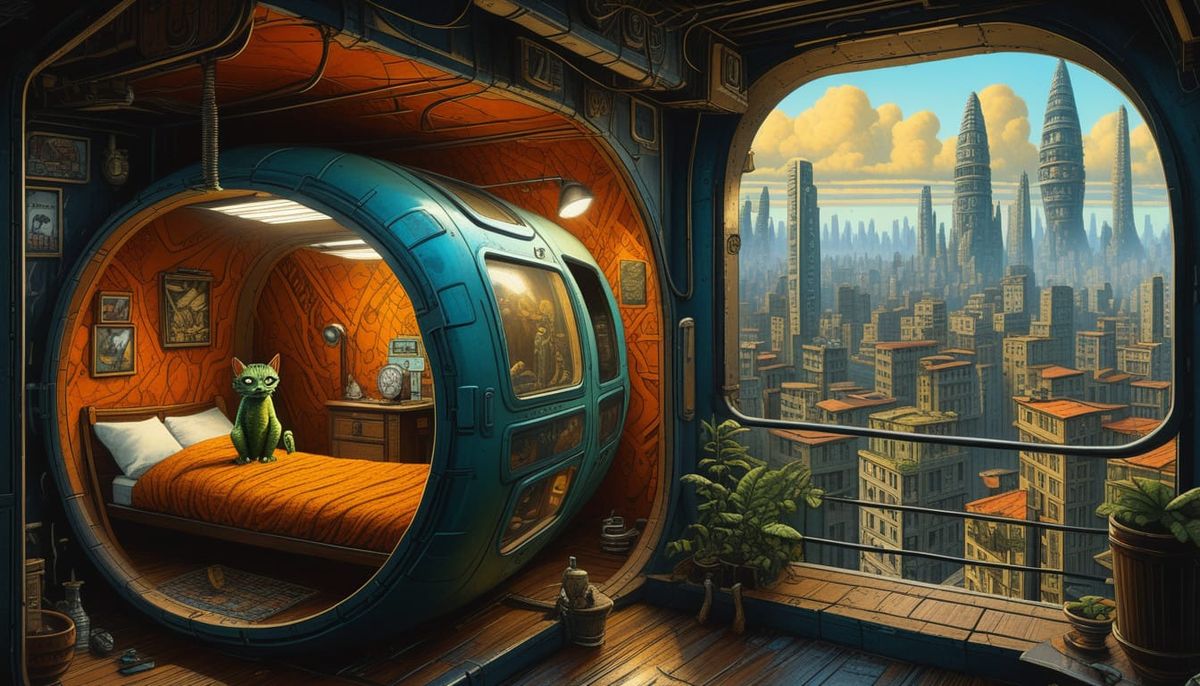 This image shows an anthropomorphic chameleon cat in a surreal, hyperdetailed retrofuturistic room overlooking a bustling city. Rendered as a scratchboard ink matte painting with deep, complementary colors.