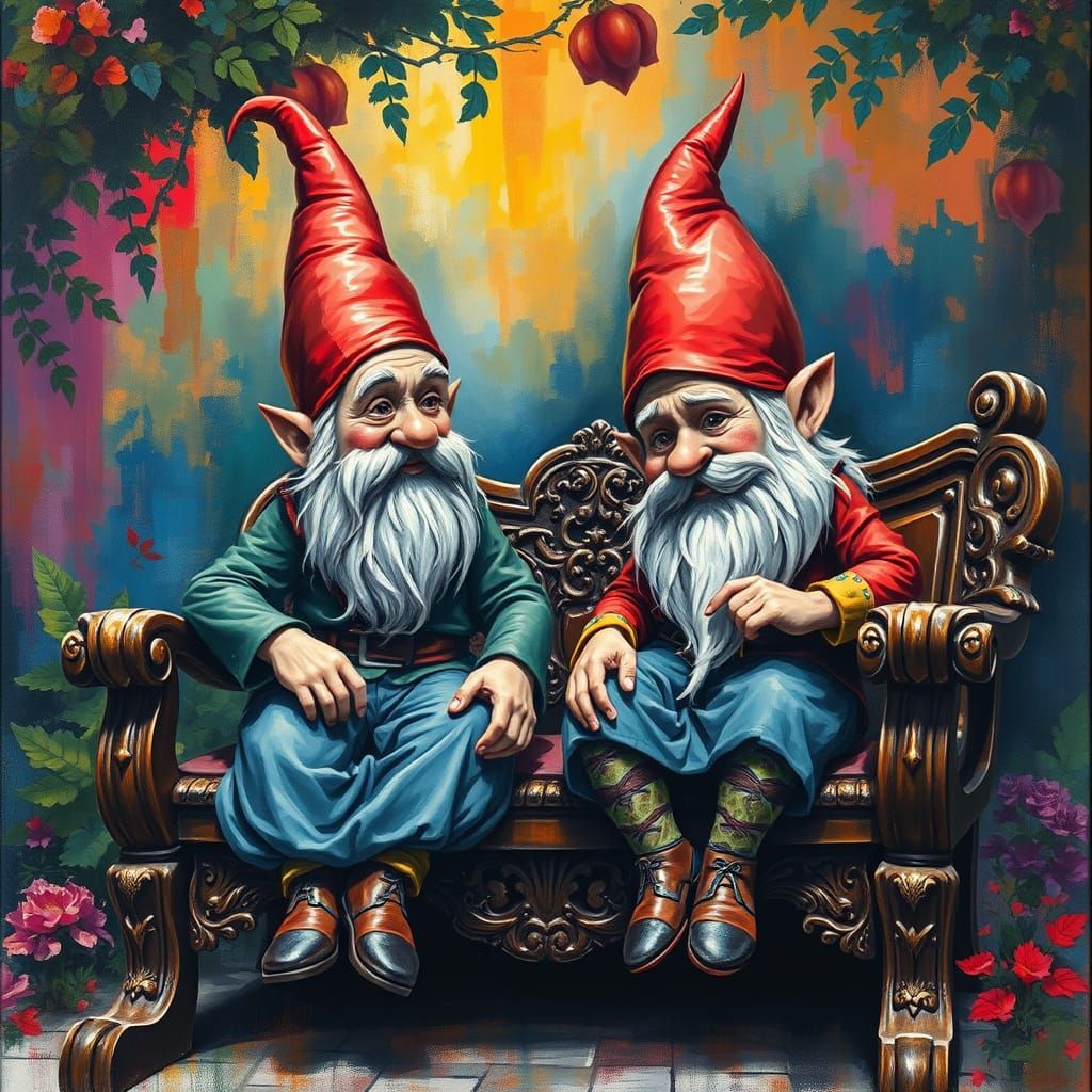 This image shows two gnomes in a fantastical world, surrounded by vibrant colors and intricate details. The artwork combines charcoal drawing with gouache and watercolor techniques, creating a tactile, three-dimensional quality with bold hues and nuanced shades. A masterpiece of maximalist art, evoking a...