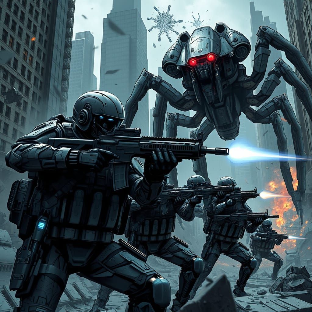 This image depicts a dynamic battle scene between soldiers in metallic battle armor and towering arachnoid robots in a dark, ruined city. The artwork is rendered in a comic book style with a cinematic feel, evoking the intensity of a live-action film still.