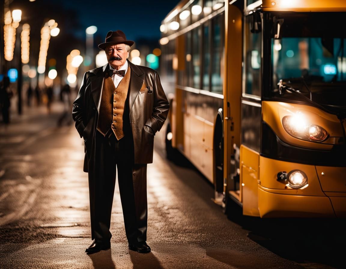 This image shows Hercule Poirot in a leather suit awaiting a bus. The professional photograph showcases warm colors, bokeh, and natural lighting achieved with a Canon lens.