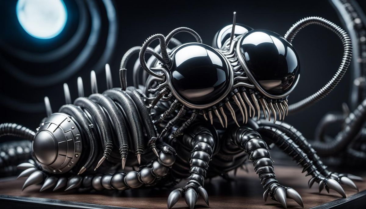 This image shows a biomechanical Mickey Mouse centipede hybrid in a horror style. The creature is highly detailed with intricate mechanical parts, rendered with hyperrealistic airbrushing and dramatic lighting.