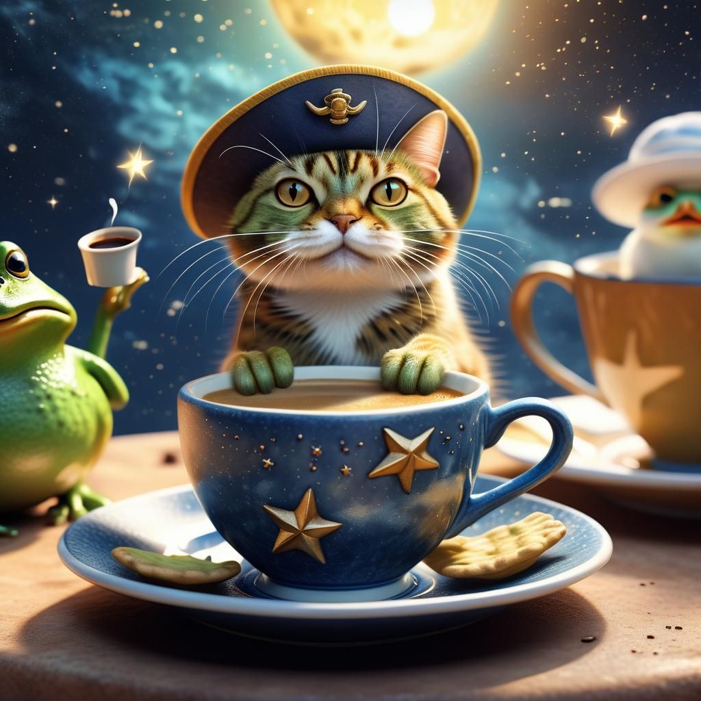 A digital artwork depicting a mustached cat, chick, and sailor frog enjoying coffee together. The photorealistic watercolor style is enhanced by soft lighting, twinkling stars, and warm coffee steam.