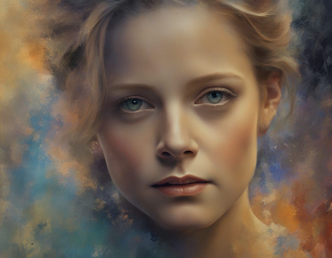 A hyperrealistic portrait of Jodie Foster in the style of a 1970s movie poster. This detailed matte painting evokes a dreamy, cinematic feel with ethereal and surreal elements.