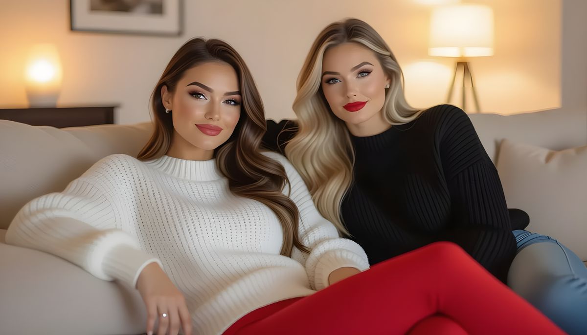 This image shows two women in a modern living room at night. One woman is reclining on a couch next to a blonde woman who is reaching towards her in a photograph.