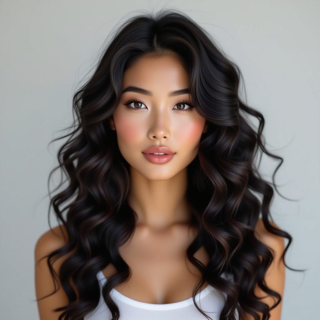 This image features a hyperrealistic portrait of an Asian woman with voluminous, curly black hair. The style emphasizes detailed texture and natural imperfections, resembling high-quality photography with a subtle anime influence.