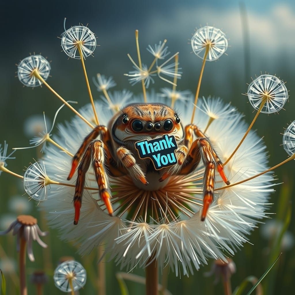 A miniature jumping spider hides in a dandelion seed head. The tiny spider wears a backpack and holds a sign, waiting for prey in a whimsical world with warm, golden light.