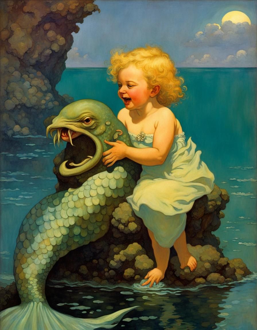 This image shows a retro-style painting of a mermaid child hugging a Lovecraftian pet. The artwork evokes Maxfield Parrish's style, emphasizing nostalgic charm and whimsical fantasy elements.