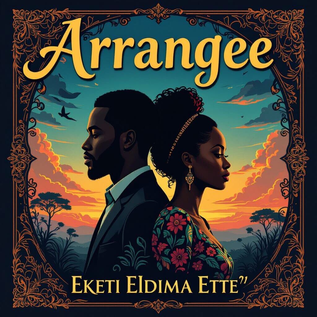 This image shows a vibrant African-themed book cover design. The title 'Arrangee' is displayed above silhouetted figures, rendered as a detailed matte painting with rich colors and fantastical elements.