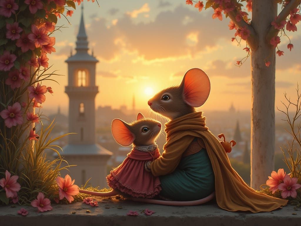 A heartwarming scene of a mouse family in adorable attire, nestled in their charming home atop a bell tower, taking in the breathtaking view of a city sunset