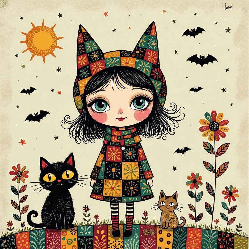 A whimsical, dreamlike portrait of a girl surrounded by her cats — a fusion of Klimtpunk opulence and hand-drawn batik textures. The scene glows with swirling gold patterns, patchwork fabrics, and layered painterly details. The cats lounge in elegant poses, their fur patterned with tiny abstract motifs and metallic highlights. The girl’s expression is serene yet mischievous, her clothing a blend of folk whimsy and steampunk grace. The overall atmosphere is tender, magical, and slightly surreal — a world where warmth, art, and imagination intertwine in glowing harmony.