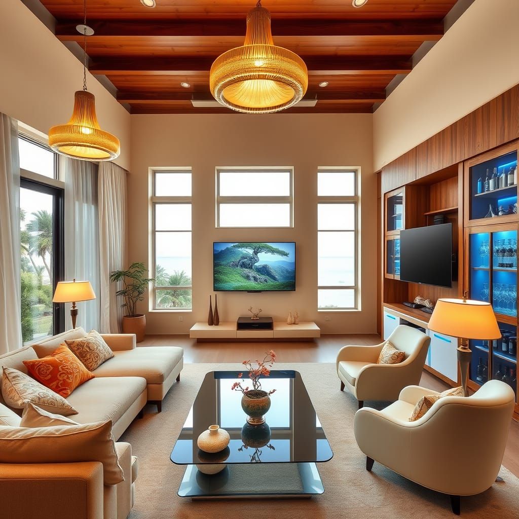 This serene modern living room features soaring ceilings, warm wood accents, and elegant glass lamps casting a radiant golden glow. Plush furniture, including a chaise longue and armchairs, is arranged around cream-colored walls and glass coffee tables, creating a peaceful atmosphere with breathtaking vi...