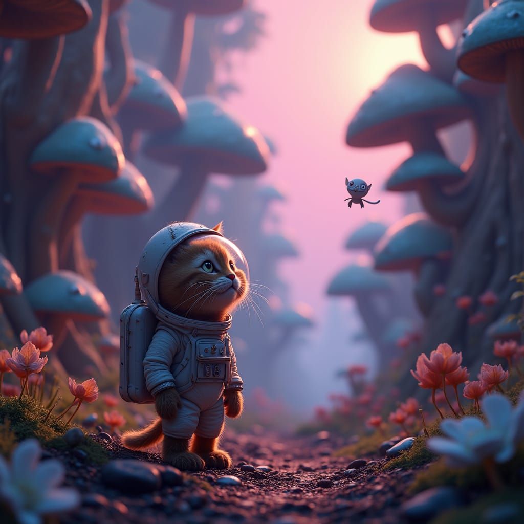 A Pixar-inspired scene of a cat astronaut standing amidst a vibrant, towering forest of bioluminescent mushrooms, with a floating alien sphere of eyes observing from above, set against a bright, radial gradient sky with a sense of wonder and discovery.
