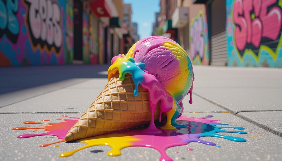 A vibrant ice cream cone melts on a sun-drenched sidewalk. This image evokes surrealism with abstract elements, complementary colors, and fine details in a graffiti street art style.