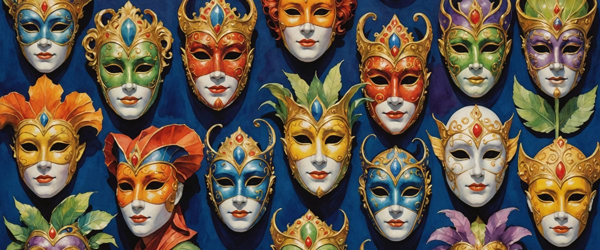 This image shows a cheerful selection of Venetian Carnival masks, rendered in watercolor and gouache. The artwork features a bright, pastel color palette with volumetric lighting.