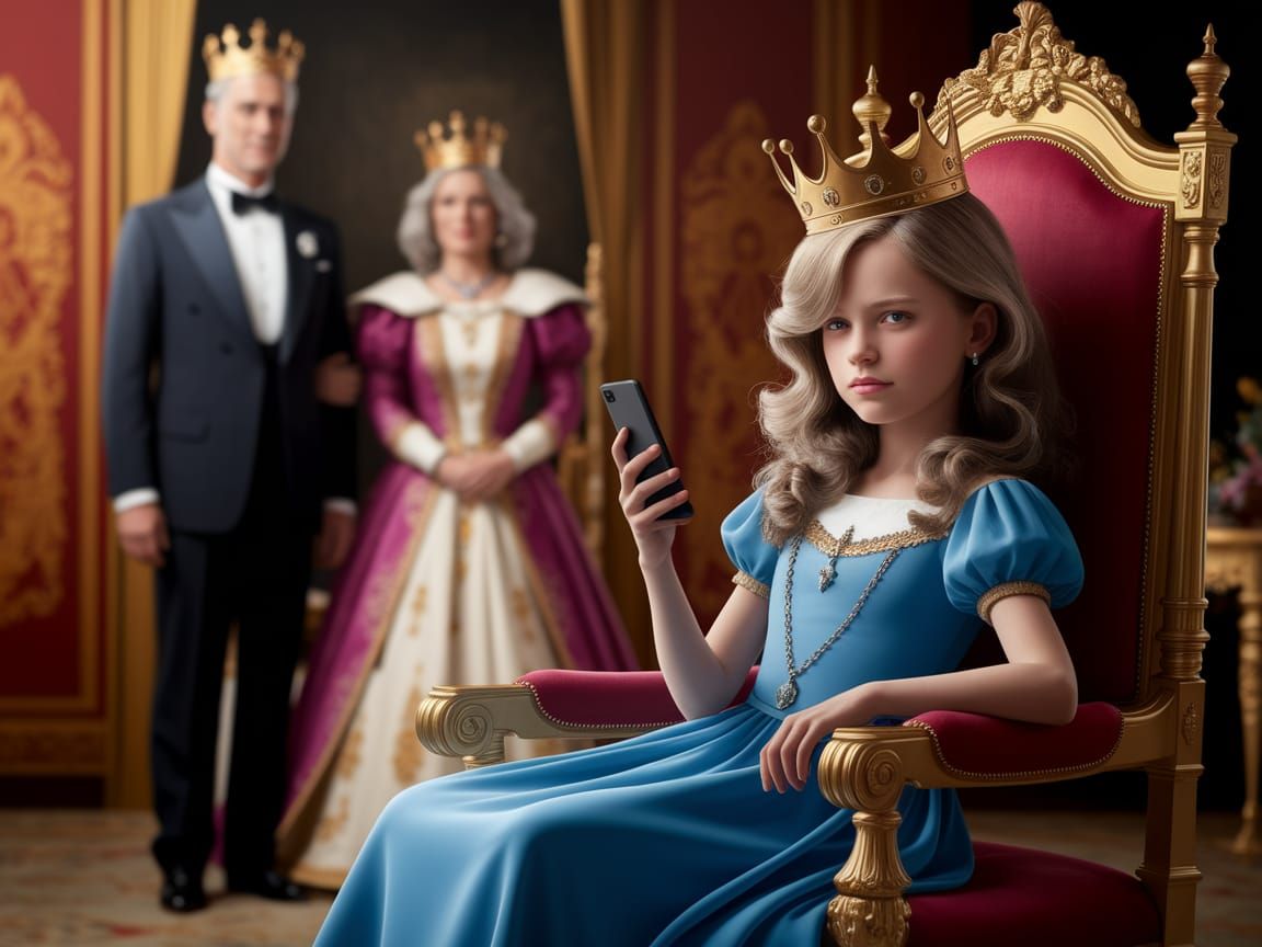 This image captures a young princess in a state of relaxed rebellion, sitting on a throne with her crown at a casual angle, as she gazes at her phone with a sense of disinterest. The softly lit room is adorned with luxurious fabrics and ornate decorations, evoking a sense of royal luxury and serenity.